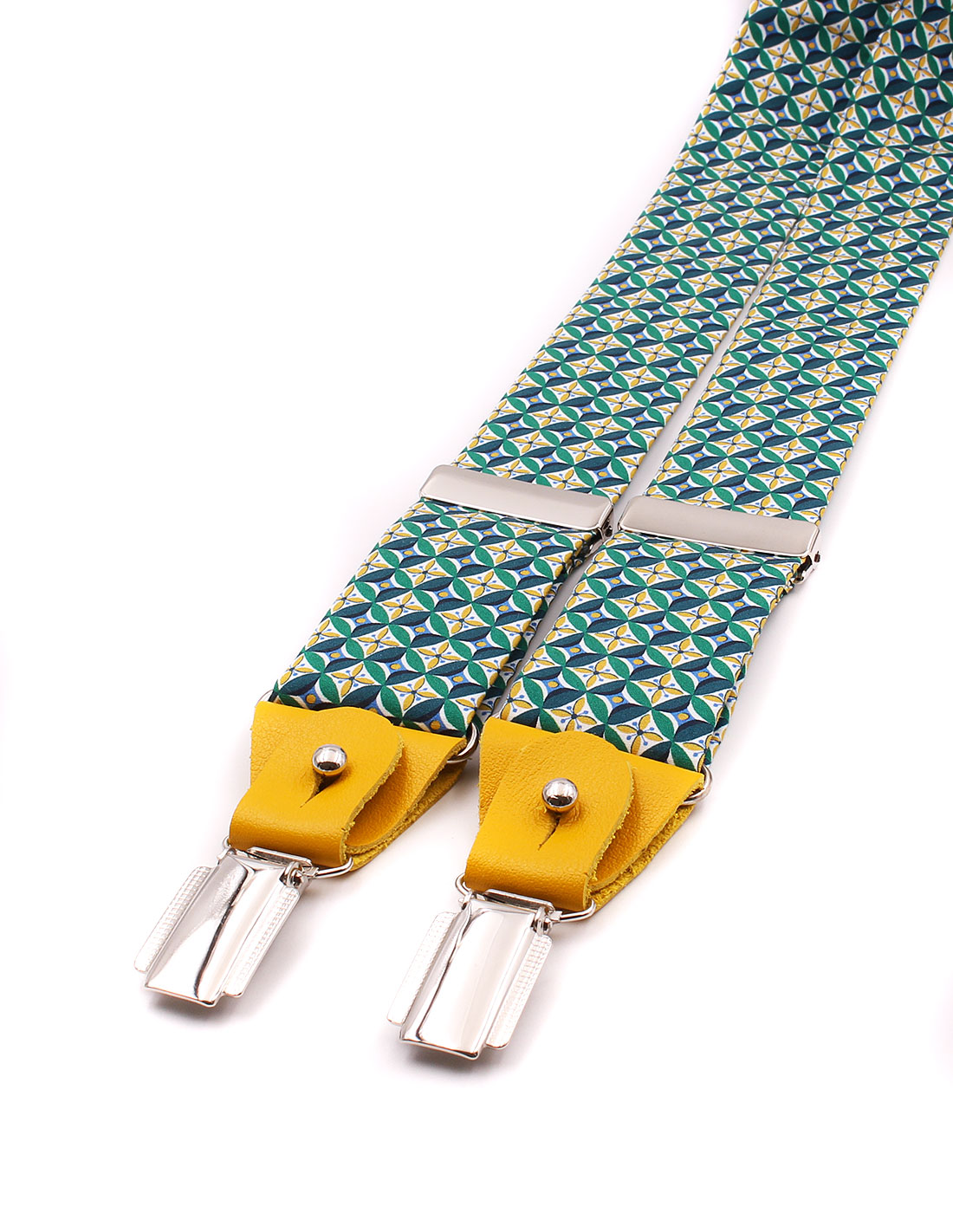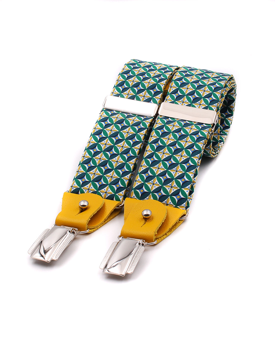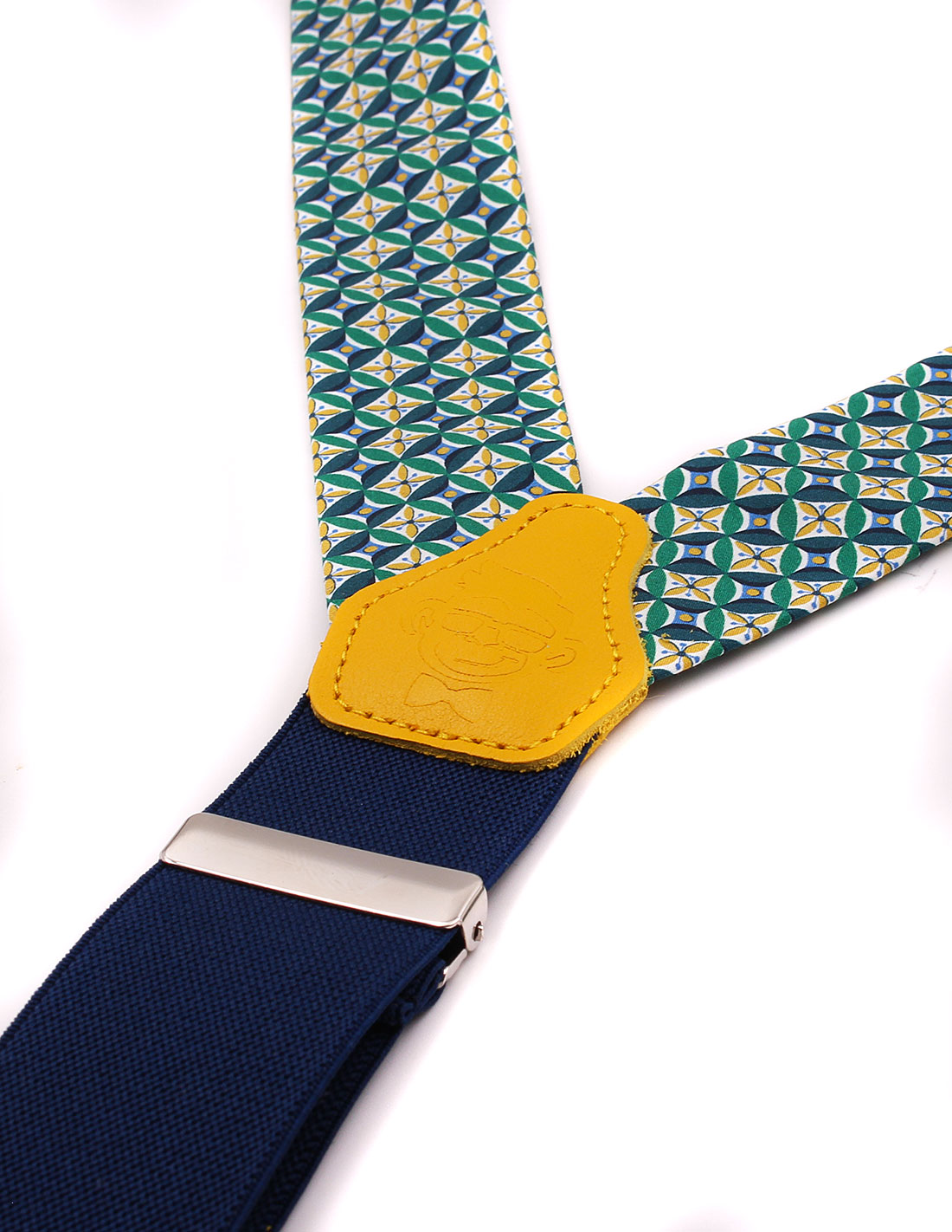 Tirantes de tela algodón 100% con elegante estampado geométrico de una anchura de 35mm, de tres pinzas en forma de Y que logra una gran sujeción al pantalón.
